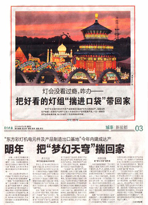 “正是基于此,提升彩燈產(chǎn)業(yè)的科技含量、完善上下游產(chǎn)業(yè)鏈、拓展衍生產(chǎn)業(yè)和加快彩燈產(chǎn)品出口貿(mào)易提上了最重要的議事日程,經(jīng)過精心籌備,‘東方彩燈制造出口基地’應(yīng)勢而生?!弊载暉糍Q(mào)有限公司董事長蔡翔介紹,該基地將著力于無線音頻控制、智能變光控制、精細化傳動控制等高新科技技術(shù)的研發(fā)與應(yīng)用,并嵌入彩燈創(chuàng)意產(chǎn)品、城市景觀亮化、道路照明、高新圣誕產(chǎn)品、微縮工藝品及仿真動物類等項目,“換句話說,這些項目將會讓自貢彩燈實現(xiàn)提檔升級,科技含量更高,文化產(chǎn)品大幅延伸!”