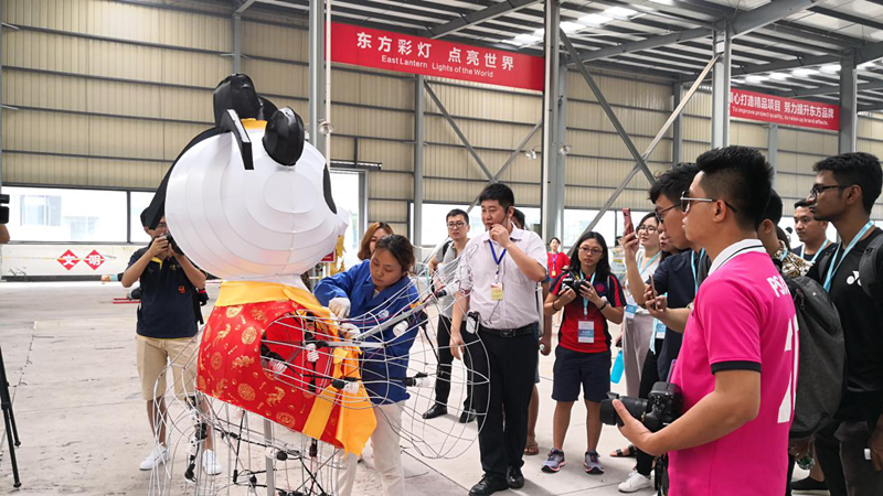走進東方彩燈出口基地,來到“東方彩燈 點亮世界”項目境外燈展制作現(xiàn)場,青年朋友們近距離的詳細了解了彩燈的制作流程和工藝。交流團成員為東方彩燈足跡遍布世界30多個國家咋咋稱奇,為燈貿(mào)集團精妙絕倫的彩燈頻頻點贊。