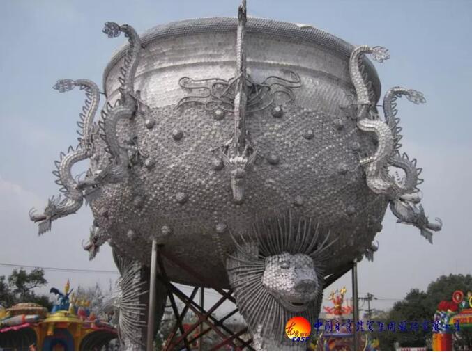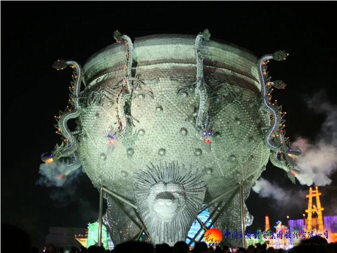 東方彩燈精心設(shè)計制作的“九龍鼎”燈組采用景德鎮(zhèn)青花玲瓏瓷具杯、羹、匙、盅、盤、碟、碗等近30萬件手工捆扎而成,主體為鋼結(jié)構(gòu);鼎高和直徑均為18米,最大處直徑26米,總重近100噸。